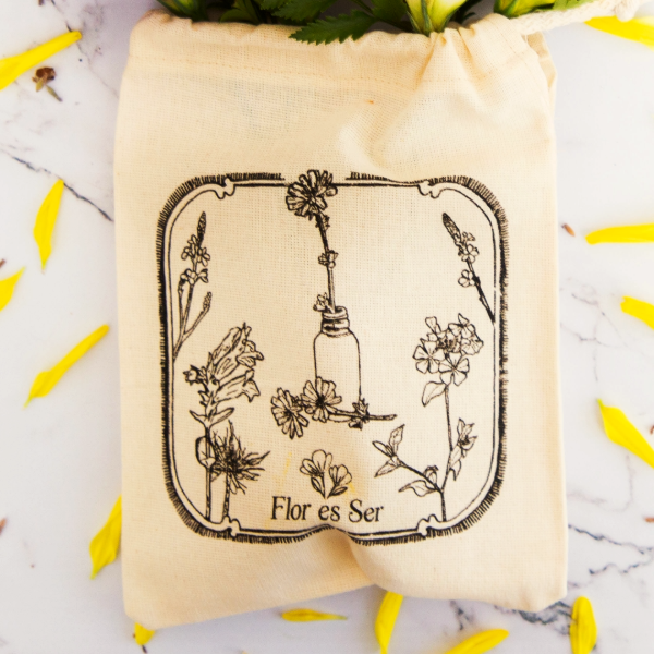Esta bolsita sublimada tiene un diseño exclusivo de Felicitas Sidders (Arte Trinum) para Flor es Ser. Con dibujos botánicos de flores que son esencias como She Oak (Bush) o Chicory (Bach).